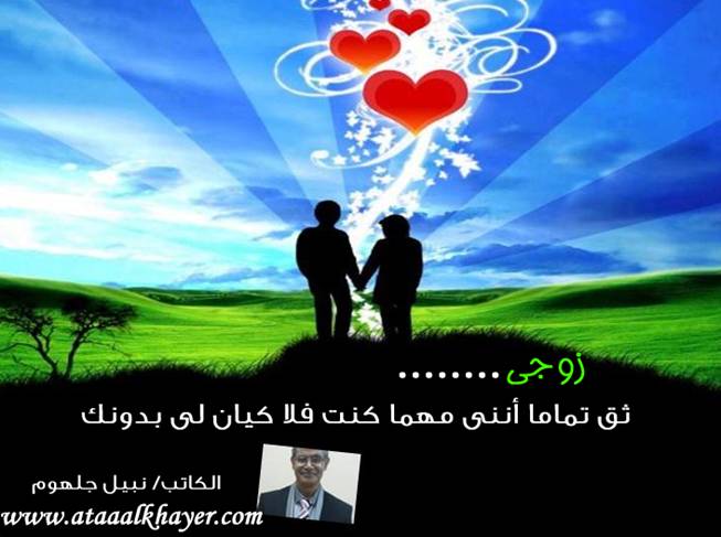 زوجي (11) من:الأخ الأستاذ / نبيل جلهوم عضو جمعية الكُتَّاب ببيت عطاء الخير عضو إتحاد الكتّاب و المثقفين العرب - مصر عضو رابطة أدباء الشام – لندن عضو الإتحاد العالمى للشعراء والمبدعين العرب عضو إتحاد المدربين العرب عضو رابطة الأدب الإسلامى العالمية http://www.ataaalkhayer.com/up/download.php?img=8293 |