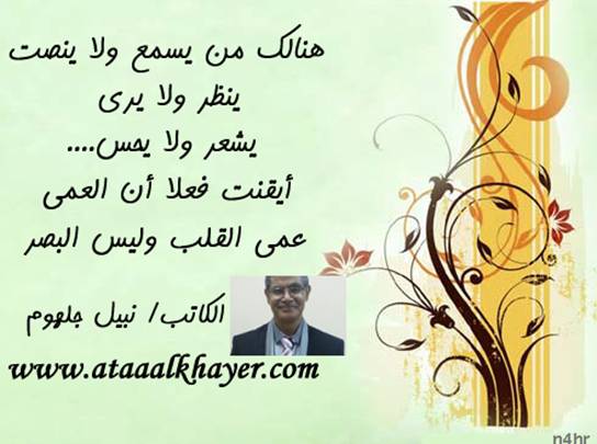العمى عمى القلب من:الأخ الأستاذ / نبيل جلهوم عضو جمعية الكُتَّاب ببيت عطاء الخير عضو إتحاد الكتّاب و المثقفين العرب - مصر عضو رابطة أدباء الشام – لندن عضو الإتحاد العالمى للشعراء والمبدعين العرب عضو إتحاد المدربين العرب عضو رابطة الأدب الإسلامى العالمية http://www.ataaalkhayer.com/up/download.php?img=8519 |