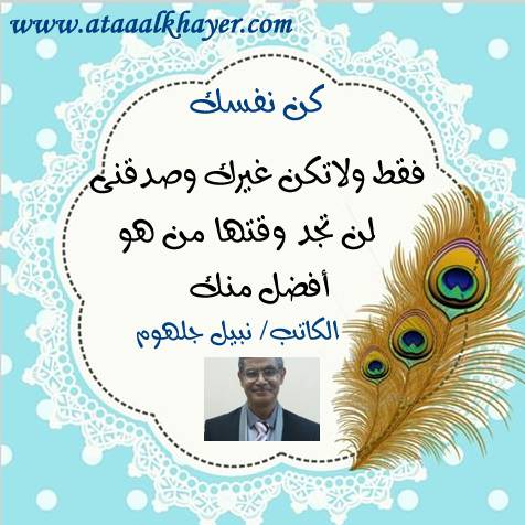 كن نفسك (05) من:الأخ الأستاذ / نبيل جلهوم عضو جمعية الكُتَّاب ببيت عطاء الخير عضو إتحاد الكتّاب و المثقفين العرب - مصر عضو رابطة أدباء الشام – لندن عضو الإتحاد العالمى للشعراء والمبدعين العرب عضو إتحاد المدربين العرب عضو رابطة الأدب الإسلامى العالمية http://www.ataaalkhayer.com/up/download.php?img=8632 |