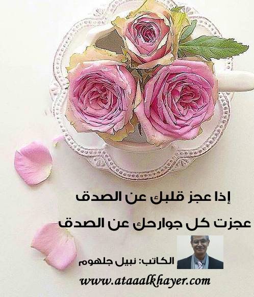 القلب والصدق من:الأخ الأستاذ / نبيل جلهوم عضو جمعية الكُتَّاب ببيت عطاء الخير عضو إتحاد الكتّاب و المثقفين العرب - مصر عضو رابطة أدباء الشام – لندن عضو الإتحاد العالمى للشعراء والمبدعين العرب عضو إتحاد المدربين العرب عضو رابطة الأدب الإسلامى العالمية http://www.ataaalkhayer.com/up/download.php?img=8734 |