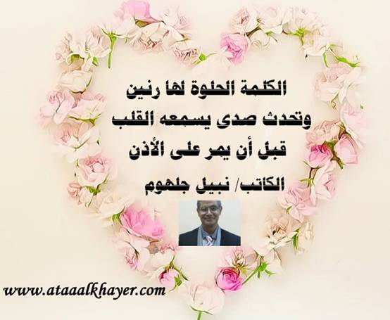 العيش في القلوب من:الأخ الأستاذ / نبيل جلهوم عضو جمعية الكُتَّاب ببيت عطاء الخير عضو إتحاد الكتّاب و المثقفين العرب - مصر عضو رابطة أدباء الشام – لندن عضو الإتحاد العالمى للشعراء والمبدعين العرب عضو إتحاد المدربين العرب عضو رابطة الأدب الإسلامى العالمية http://www.ataaalkhayer.com/up/download.php?img=8769 |