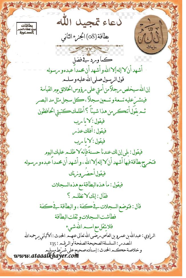 دعاء تمجيد الله بطاقة (08) الجزء الثاني http://www.ataaalkhayer.com/up/download.php?img=9641 من:الأخ الدكتور / عبدالله بن مراد العطرجي عضو جمعية الكُتَّاب ببيت عطاء الخير |