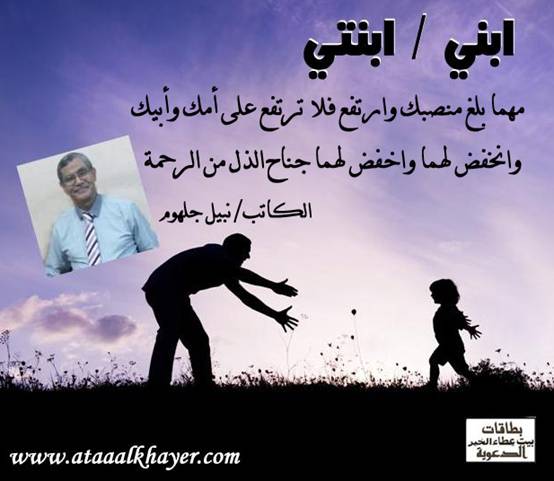 ابني / ابنتي (20) من:الأخ الأستاذ / نبيل جلهوم عضو جمعية الكُتَّاب ببيت عطاء الخير عضو إتحاد الكتّاب و المثقفين العرب - مصر عضو رابطة أدباء الشام – لندن عضو الإتحاد العالمى للشعراء والمبدعين العرب عضو إتحاد المدربين العرب عضو رابطة الأدب الإسلامى العالمية http://www.ataaalkhayer.com/up/download.php?img=9840 |