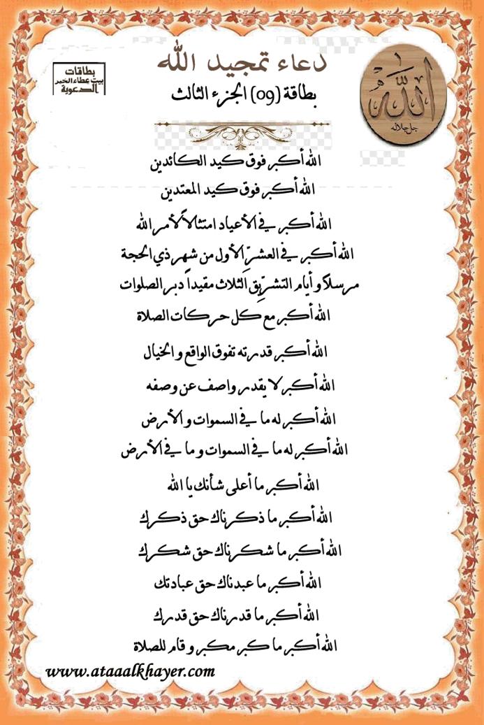 دعاء تمجيد الله بطاقة (09) الجزء الثالث http://www.ataaalkhayer.com/up/download.php?img=9641 من:الأخ الدكتور / عبدالله بن مراد العطرجي عضو جمعية الكُتَّاب ببيت عطاء الخير |