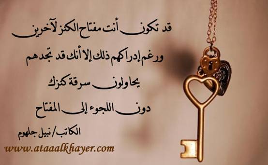 كنزك والمفتاح من:الأخ الأستاذ / نبيل جلهوم عضو جمعية الكُتَّاب ببيت عطاء الخير عضو إتحاد الكتّاب و المثقفين العرب - مصر عضو رابطة أدباء الشام – لندن عضو الإتحاد العالمى للشعراء والمبدعين العرب عضو إتحاد المدربين العرب عضو رابطة الأدب الإسلامى العالمية http://www.ataaalkhayer.com/up/download.php?img=9905 |