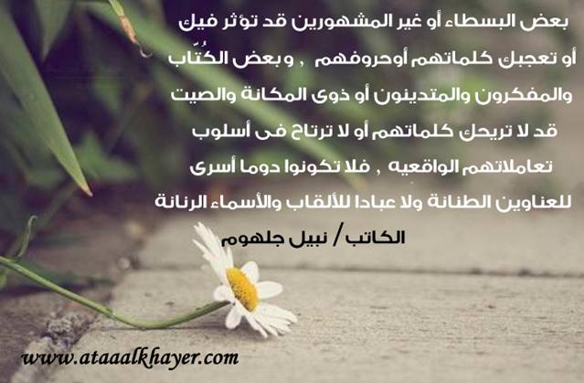 الأسماء الرنانة من:الأخ الأستاذ / نبيل جلهوم عضو جمعية الكُتَّاب ببيت عطاء الخير عضو إتحاد الكتّاب و المثقفين العرب - مصر عضو رابطة أدباء الشام – لندن عضو الإتحاد العالمى للشعراء والمبدعين العرب عضو إتحاد المدربين العرب عضو رابطة الأدب الإسلامى العالمية http://www.ataaalkhayer.com/up/download.php?img=9927 |