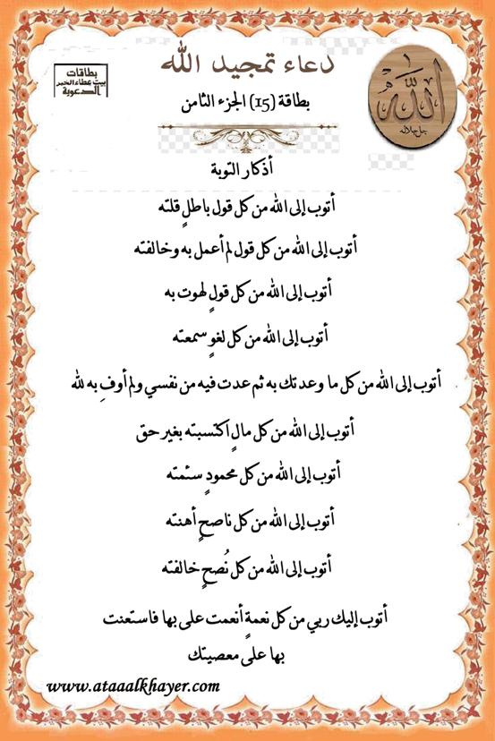 دعاء تمجيد الله بطاقة (15) الجزء الثامن http://www.ataaalkhayer.com/up/download.php?img=9641 من:الأخ الدكتور / عبدالله بن مراد العطرجي عضو جمعية الكُتَّاب ببيت عطاء الخير |