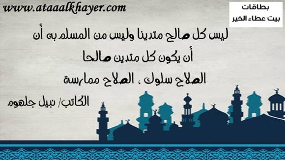 الصلاح ممارسة من:الأخ الأستاذ / نبيل جلهوم عضو جمعية الكُتَّاب ببيت عطاء الخير عضو إتحاد الكتّاب و المثقفين العرب - مصر عضو رابطة أدباء الشام – لندن عضو الإتحاد العالمى للشعراء والمبدعين العرب عضو إتحاد المدربين العرب عضو رابطة الأدب الإسلامى العالمية http://www.ataaalkhayer.com/up/download.php?img=10574 |