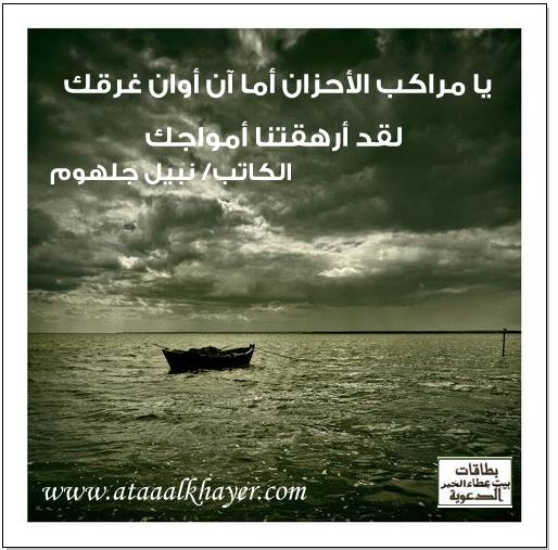 يا مراكب الأحزان من:الأخ الأستاذ / نبيل جلهوم عضو جمعية الكُتَّاب ببيت عطاء الخير عضو إتحاد الكتّاب و المثقفين العرب - مصر عضو رابطة أدباء الشام – لندن عضو الإتحاد العالمى للشعراء والمبدعين العرب عضو إتحاد المدربين العرب عضو رابطة الأدب الإسلامى العالمية http://www.ataaalkhayer.com/up/download.php?img=10711 |