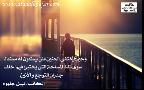 وحين يختفي الحنين من:الأخ الأستاذ / نبيل جلهوم عضو جمعية الكُتَّاب ببيت عطاء الخير عضو إتحاد الكتّاب و المثقفين العرب - مصر عضو رابطة أدباء الشام – لندن عضو الإتحاد العالمى للشعراء والمبدعين العرب عضو إتحاد المدربين العرب عضو رابطة الأدب الإسلامى العالمية http://www.ataaalkhayer.com/up/download.php?img=10824 |