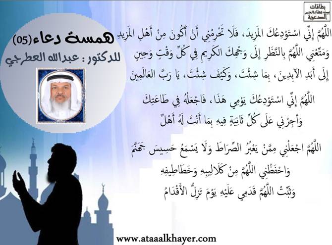 همسة دعاء (05) http://www.ataaalkhayer.com/up/download.php?img=9641 من:الأخ الدكتور / عبدالله بن مراد العطرجي عضو جمعية الكُتَّاب ببيت عطاء الخير |