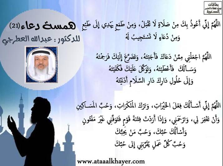 همسة دعاء (21) http://www.ataaalkhayer.com/up/download.php?img=9641 من:الأخ الدكتور / عبدالله بن مراد العطرجي عضو جمعية الكُتَّاب ببيت عطاء الخير |