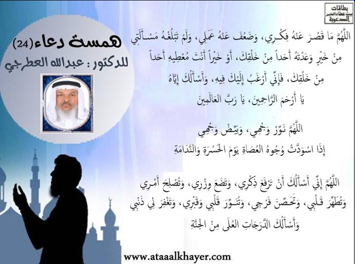 همسة دعاء (24) http://www.ataaalkhayer.com/up/download.php?img=9641 من:الأخ الدكتور / عبدالله بن مراد العطرجي عضو جمعية الكُتَّاب ببيت عطاء الخير |