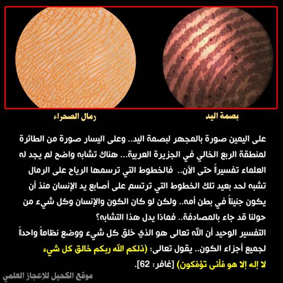 من:الأخ المهندس / عبدالدائم الكحيل http://www.ataaalkhayer.com/up/download.php?img=9641 صورة وآية: بصمة اليد ورمال الصحراء في كل شيء له آية تشهد على أنه واحد أحد.. نتأمل تشابه مذهل بين الخطوط على بصمة اليد والخطوط التي رسمتها الرياح على رمال الصحراء.. ونسبح الخالق تعالى.... بقلم المهندس/ عبد الدائم الكحيل |