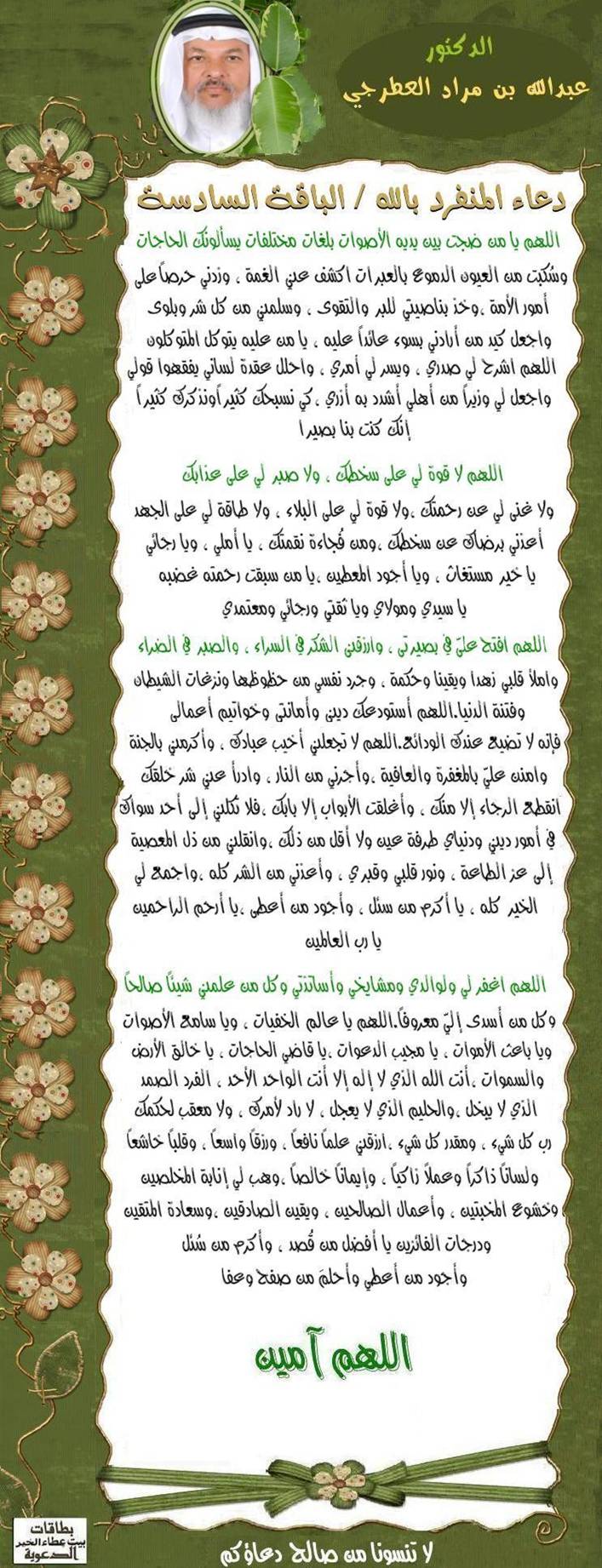 دعاء اليوم http://www.ataaalkhayer.com/up/download.php?img=9642 من:الأخ الزميل / جوود موون - أبو حسن بالتعاون مع الشكر للأخت الفاضلة الزميلة / ديدو دي - خبيرة الأرصاد ببيتنا بطاقات دعاء الأخ الدكتور / عبدالله بن مراد العطرجى |