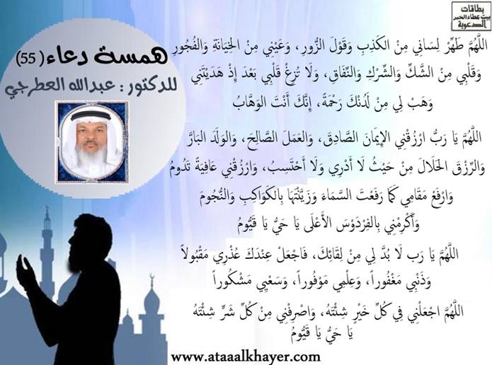 همسة دعاء(55) http://www.ataaalkhayer.com/up/download.php?img=9641 من:الأخ الدكتور / عبدالله بن مراد العطرجي عضو جمعية الكُتَّاب ببيت عطاء الخير |