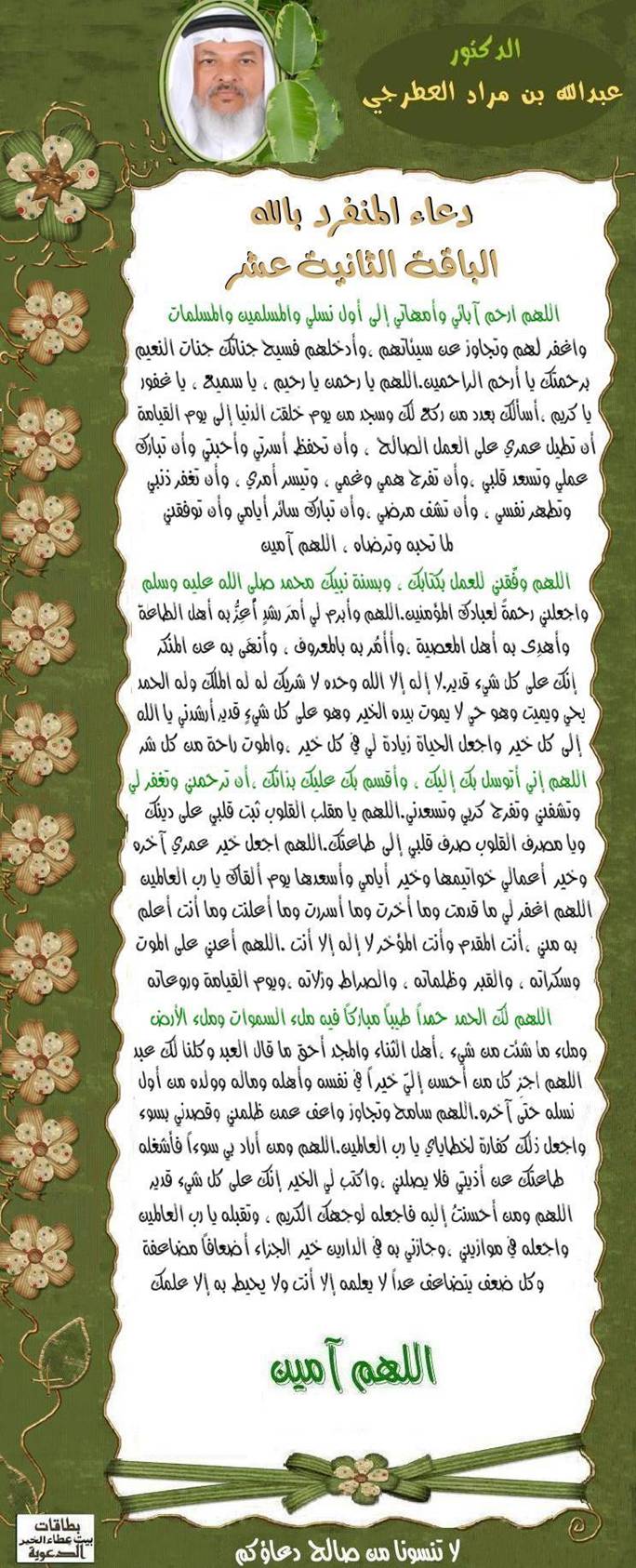 دعاء اليوم http://www.ataaalkhayer.com/up/download.php?img=9642 من:الأخ الزميل / جوود موون - أبو حسن بالتعاون مع الشكر للأخت الفاضلة الزميلة / ديدو دي - خبيرة الأرصاد ببيتنا بطاقات دعاء الأخ الدكتور / عبدالله بن مراد العطرجى |