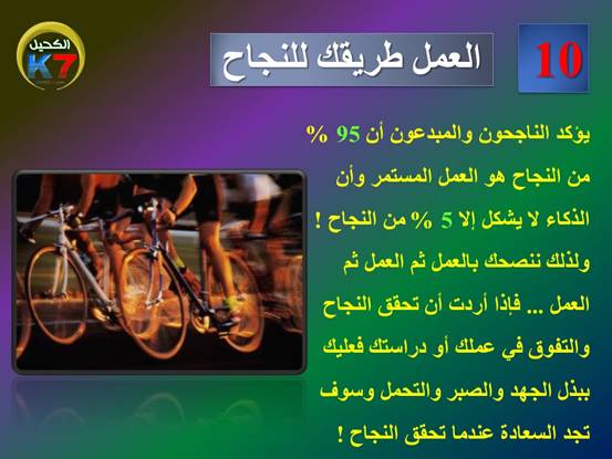 من:الأخ المهندس / عبدالدائم الكحيل http://www.ataaalkhayer.com/up/download.php?img=9641 نصائح للنجاح (10) هذه نصائحي لكل من يطمح للنجاح.. بعد التوكل على الله تعالى.. فالنجاح هو عملية فيزيائية طبيعية يمكن للإنسان أن يحققها إذا اتبع قواعد محددة.. مع اليقين بأن النجاح بيد الله وحده وليس بيدك! بقلم المهندس/ عبد الدائم الكحيل |
