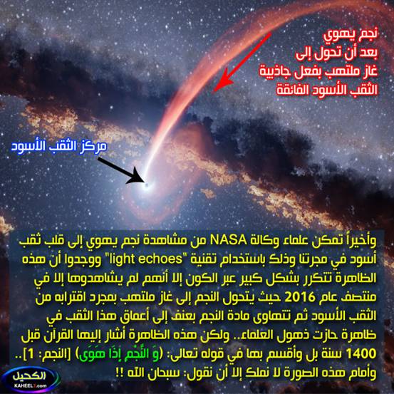 من:الأخ المهندس / عبدالدائم الكحيل http://www.ataaalkhayer.com/up/download.php?img=9641 صورة وآية: نجم يهوي هل شاهدت نجماً يهوي إلى أعماق ثقب أسود من قبل؟ هذا ما رآه العلماء 2016 باستخدام تقنية جديدة تكشف الأشعة تحت الحمراء الصادرة عن دخان النجم المتهاوي.. لنتأمل.... بقلم المهندس/ عبد الدائم الكحيل |