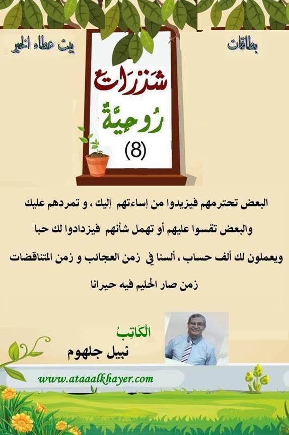 شذرات روحية (08) من:الأخ الأستاذ / نبيل جلهوم عضو جمعية الكُتَّاب ببيت عطاء الخير عضو إتحاد الكتّاب و المثقفين العرب - مصر عضو رابطة أدباء الشام – لندن عضو الإتحاد العالمى للشعراء والمبدعين العرب عضو إتحاد المدربين العرب عضو رابطة الأدب الإسلامى العالمية http://www.ataaalkhayer.com/up/download.php?img=12050 |