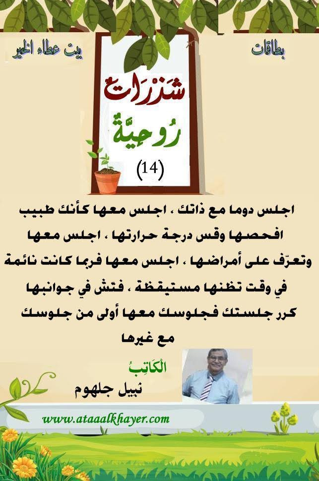 شذرات روحية (14) من:الأخ الأستاذ / نبيل جلهوم عضو جمعية الكُتَّاب ببيت عطاء الخير عضو إتحاد الكتّاب و المثقفين العرب - مصر عضو رابطة أدباء الشام – لندن عضو الإتحاد العالمى للشعراء والمبدعين العرب عضو إتحاد المدربين العرب عضو رابطة الأدب الإسلامى العالمية http://www.ataaalkhayer.com/up/download.php?img=12094 |