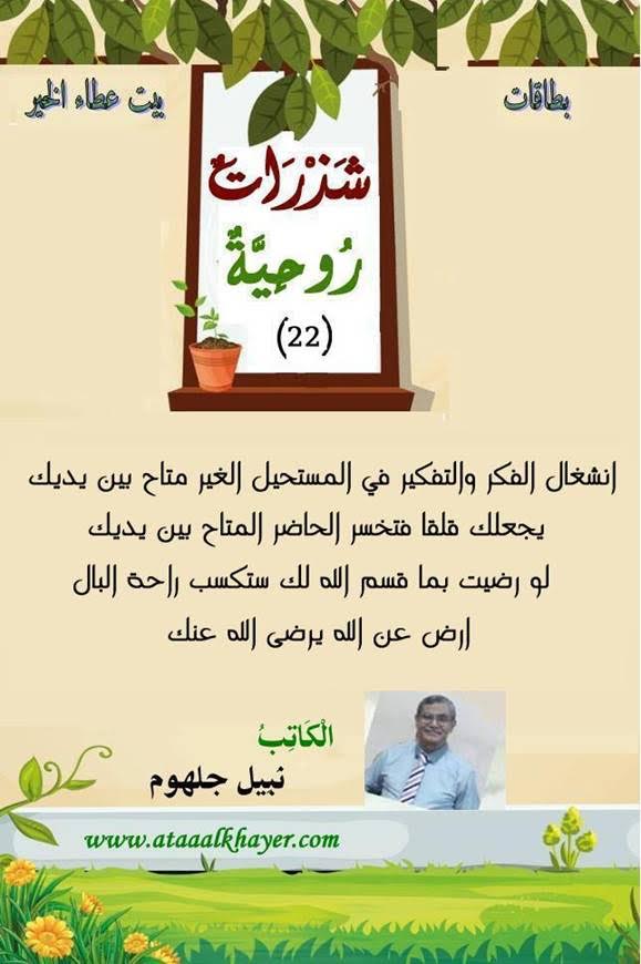 شذرات روحية (22) من:الأخ الأستاذ / نبيل جلهوم عضو جمعية الكُتَّاب ببيت عطاء الخير عضو إتحاد الكتّاب و المثقفين العرب - مصر عضو رابطة أدباء الشام – لندن عضو الإتحاد العالمى للشعراء والمبدعين العرب عضو إتحاد المدربين العرب عضو رابطة الأدب الإسلامى العالمية http://www.ataaalkhayer.com/up/download.php?img=12142 |