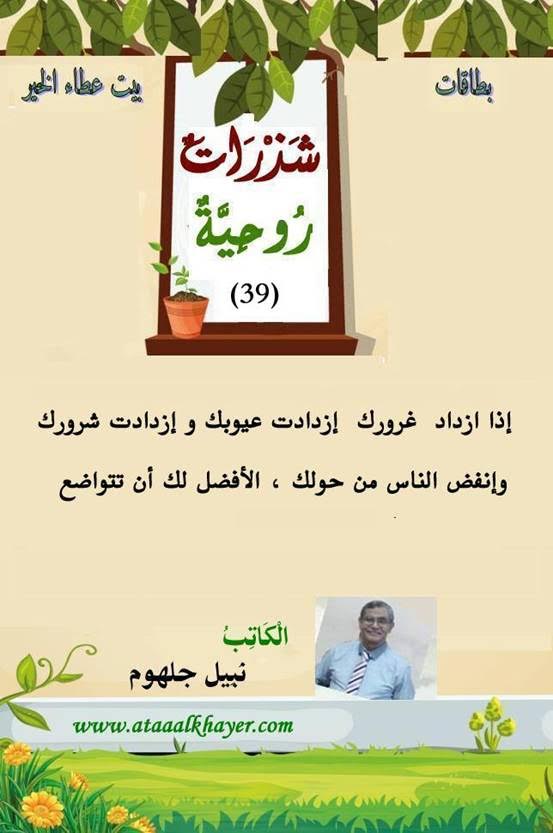 شذرات روحية (39) من:الأخ الأستاذ / نبيل جلهوم عضو جمعية الكُتَّاب ببيت عطاء الخير عضو إتحاد الكتّاب و المثقفين العرب - مصر عضو رابطة أدباء الشام – لندن عضو الإتحاد العالمى للشعراء والمبدعين العرب عضو إتحاد المدربين العرب عضو رابطة الأدب الإسلامى العالمية http://www.ataaalkhayer.com/up/download.php?img=12309 |