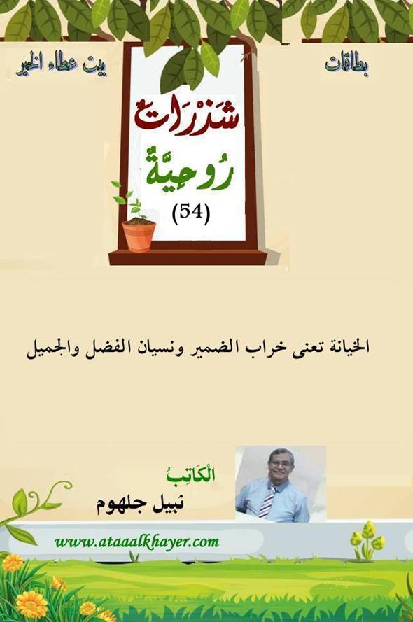 شذرات روحية (54) من:الأخ الأستاذ / نبيل جلهوم عضو جمعية الكُتَّاب ببيت عطاء الخير عضو إتحاد الكتّاب و المثقفين العرب - مصر عضو رابطة أدباء الشام – لندن عضو الإتحاد العالمى للشعراء والمبدعين العرب عضو إتحاد المدربين العرب عضو رابطة الأدب الإسلامى العالمية http://www.ataaalkhayer.com/up/download.php?img=12558 |