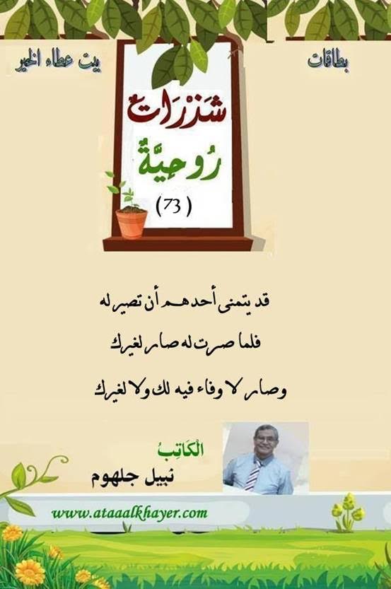 شذرات روحية (73) من:الأخ الأستاذ / نبيل جلهوم عضو جمعية الكُتَّاب ببيت عطاء الخير عضو إتحاد الكتّاب و المثقفين العرب - مصر عضو رابطة أدباء الشام – لندن عضو الإتحاد العالمى للشعراء والمبدعين العرب عضو إتحاد المدربين العرب عضو رابطة الأدب الإسلامى العالمية http://www.ataaalkhayer.com/up/download.php?img=12629 |