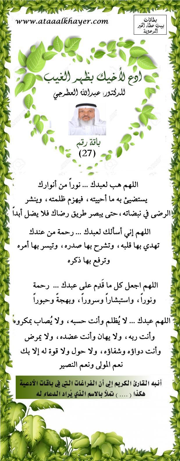 ادع لأخيك بظهر الغيب من سلسة كتب دعاء المنفرد بالله http://www.ataaalkhayer.com/up/download.php?img=9641 بطاقة (27) |