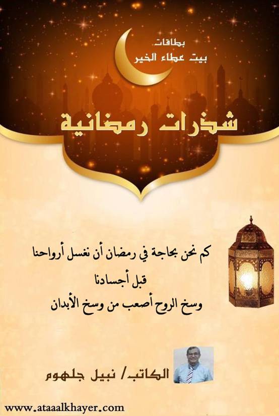 شذرات رمضانية (24) من:الأخ الأستاذ / نبيل جلهوم عضو جمعية الكُتَّاب ببيت عطاء الخير عضو إتحاد الكتّاب و المثقفين العرب - مصر عضو رابطة أدباء الشام – لندن عضو الإتحاد العالمى للشعراء والمبدعين العرب عضو إتحاد المدربين العرب عضو رابطة الأدب الإسلامى العالمية http://www.ataaalkhayer.com/up/download.php?img=12890 |
