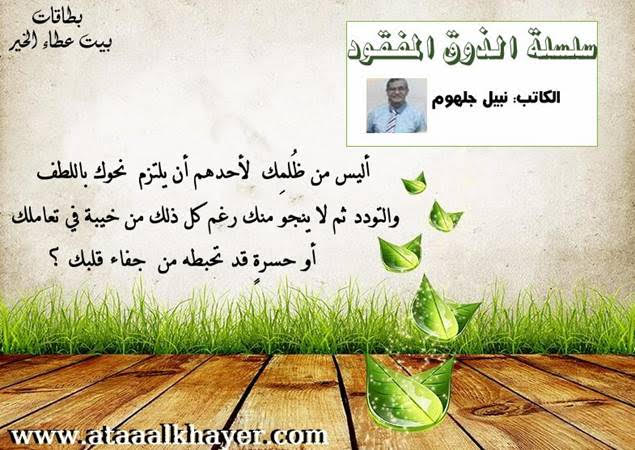 سلسلة الذوق المفقود (02) من:الأخ الأستاذ / نبيل جلهوم عضو جمعية الكُتَّاب ببيت عطاء الخير عضو إتحاد الكتّاب و المثقفين العرب - مصر عضو رابطة أدباء الشام – لندن عضو الإتحاد العالمى للشعراء والمبدعين العرب عضو إتحاد المدربين العرب عضو رابطة الأدب الإسلامى العالمية http://www.ataaalkhayer.com/up/download.php?img=13563 |