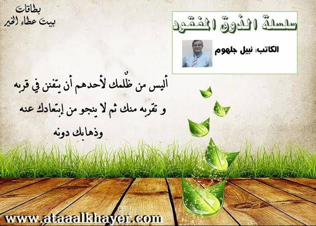 سلسلة الذوق المفقود (07) من:الأخ الأستاذ / نبيل جلهوم عضو جمعية الكُتَّاب ببيت عطاء الخير عضو إتحاد الكتّاب و المثقفين العرب - مصر عضو رابطة أدباء الشام – لندن عضو الإتحاد العالمى للشعراء والمبدعين العرب عضو إتحاد المدربين العرب عضو رابطة الأدب الإسلامى العالمية http://www.ataaalkhayer.com/up/download.php?img=13588 |