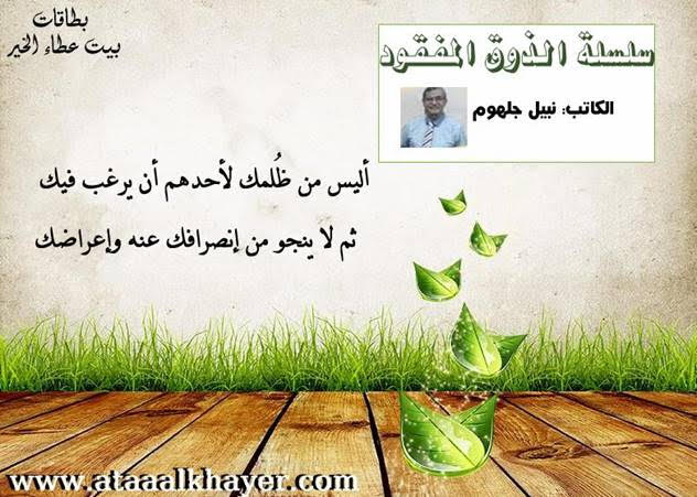 سلسلة الذوق المفقود (09) من:الأخ الأستاذ / نبيل جلهوم عضو جمعية الكُتَّاب ببيت عطاء الخير عضو إتحاد الكتّاب و المثقفين العرب - مصر عضو رابطة أدباء الشام – لندن عضو الإتحاد العالمى للشعراء والمبدعين العرب عضو إتحاد المدربين العرب عضو رابطة الأدب الإسلامى العالمية http://www.ataaalkhayer.com/up/download.php?img=13598 |