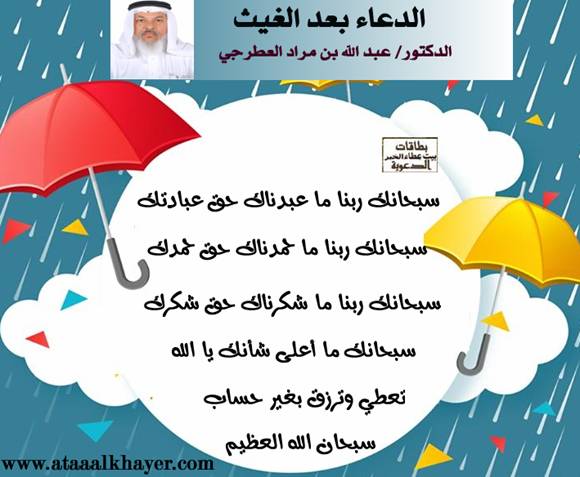 ادع لأخيك بظهر الغيب من سلسة كتب دعاء المنفرد بالله http://www.ataaalkhayer.com/up/download.php?img=9641 الدعاء بعد الغيث (01) http://www.ataaalkhayer.com/up/download.php?img=13945 |