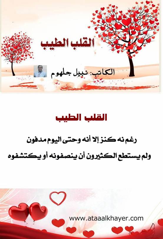 القلب الطيب (27) من:الأخ الأستاذ / نبيل جلهوم عضو جمعية الكُتَّاب ببيت عطاء الخير عضو إتحاد الكتّاب و المثقفين العرب - مصر عضو رابطة أدباء الشام – لندن عضو الإتحاد العالمى للشعراء والمبدعين العرب عضو إتحاد المدربين العرب عضو رابطة الأدب الإسلامى العالمية http://www.ataaalkhayer.com/up/download.php?img=14302 |
