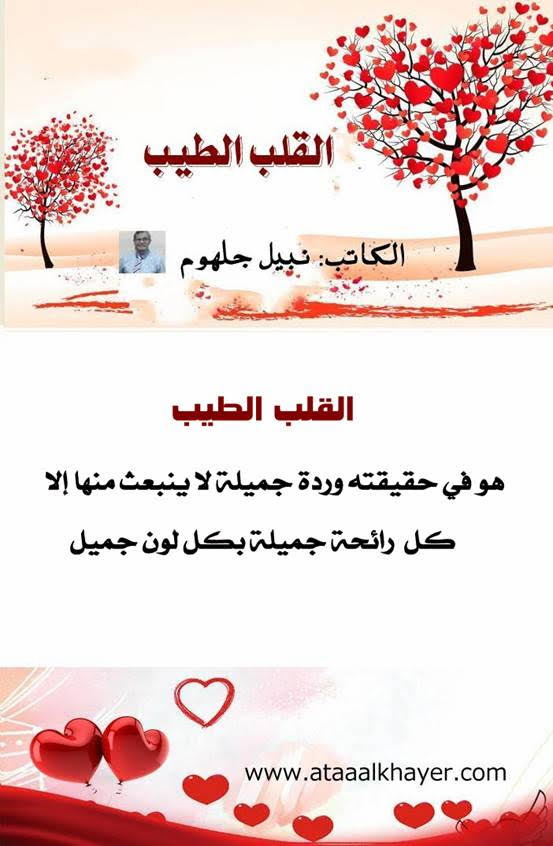 القلب الطيب (46) من:الأخ الأستاذ / نبيل جلهوم عضو جمعية الكُتَّاب ببيت عطاء الخير عضو إتحاد الكتّاب و المثقفين العرب - مصر عضو رابطة أدباء الشام – لندن عضو الإتحاد العالمى للشعراء والمبدعين العرب عضو إتحاد المدربين العرب عضو رابطة الأدب الإسلامى العالمية http://www.ataaalkhayer.com/up/download.php?img=14440 |