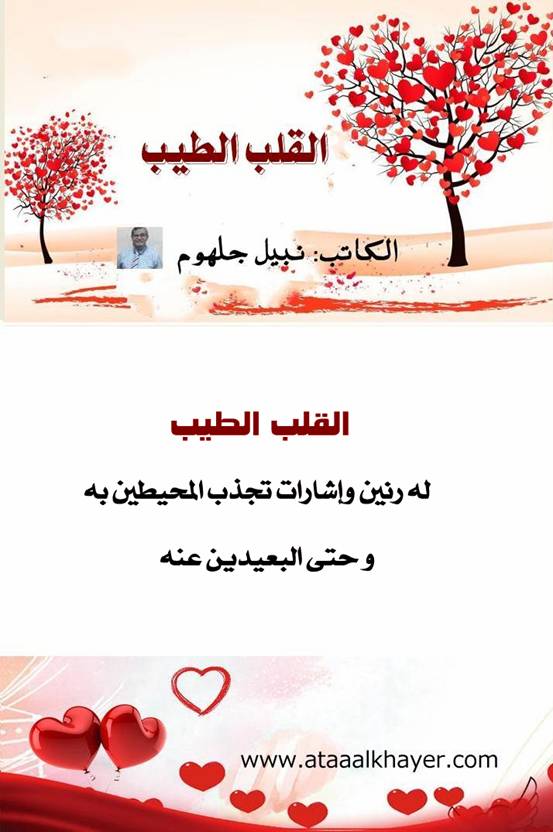 القلب الطيب (05) من:الأخ الأستاذ / نبيل جلهوم عضو جمعية الكُتَّاب ببيت عطاء الخير عضو إتحاد الكتّاب و المثقفين العرب - مصر عضو رابطة أدباء الشام – لندن عضو الإتحاد العالمى للشعراء والمبدعين العرب عضو إتحاد المدربين العرب عضو رابطة الأدب الإسلامى العالمية http://www.ataaalkhayer.com/up/download.php?img=14155 |