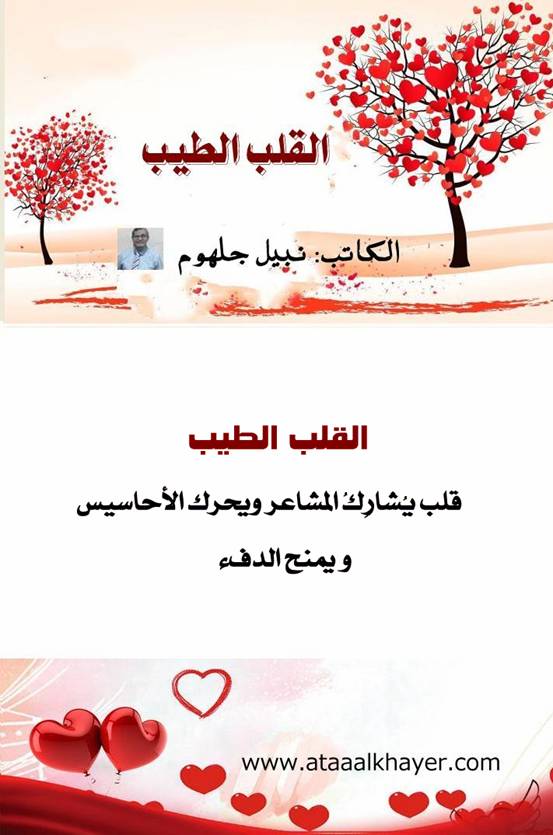 القلب الطيب (10) من:الأخ الأستاذ / نبيل جلهوم عضو جمعية الكُتَّاب ببيت عطاء الخير عضو إتحاد الكتّاب و المثقفين العرب - مصر عضو رابطة أدباء الشام – لندن عضو الإتحاد العالمى للشعراء والمبدعين العرب عضو إتحاد المدربين العرب عضو رابطة الأدب الإسلامى العالمية http://www.ataaalkhayer.com/up/download.php?img=14183 |