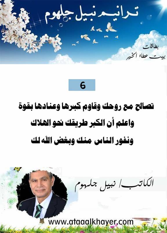 ترانيم نبيل جلهوم (06) من:الأخ الأستاذ / نبيل جلهوم عضو جمعية الكُتَّاب ببيت عطاء الخير عضو إتحاد الكتّاب و المثقفين العرب - مصر عضو رابطة أدباء الشام – لندن عضو الإتحاد العالمى للشعراء والمبدعين العرب عضو إتحاد المدربين العرب عضو رابطة الأدب الإسلامى العالمية http://www.ataaalkhayer.com/up/download.php?img=14631 |
