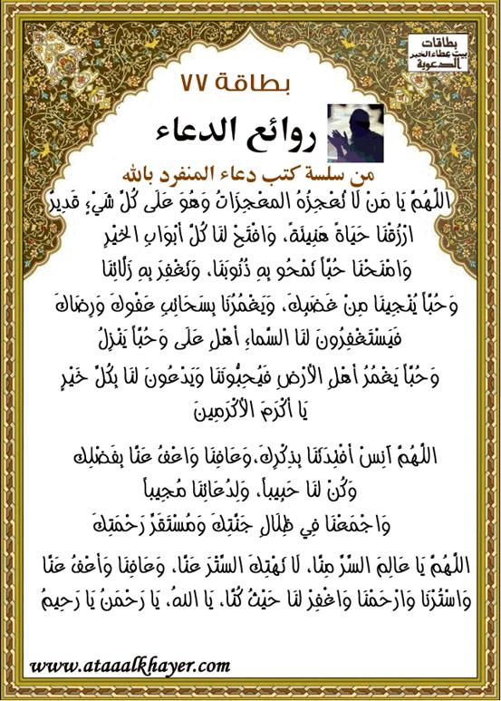 ادع لأخيك بظهر الغيب من سلسة كتب دعاء المنفرد بالله http://www.ataaalkhayer.com/up/download.php?img=9641 روائع الدعاء (77) http://www.ataaalkhayer.com/up/download.php?img=14652 |