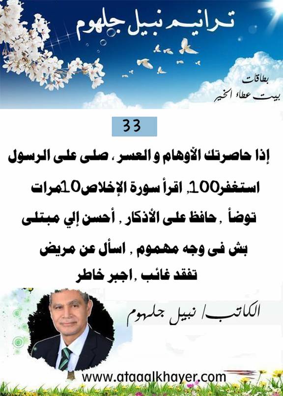 ترانيم نبيل جلهوم (33) من:الأخ الأستاذ / نبيل جلهوم عضو جمعية الكُتَّاب ببيت عطاء الخير عضو إتحاد الكتّاب و المثقفين العرب - مصر عضو رابطة أدباء الشام – لندن عضو الإتحاد العالمى للشعراء والمبدعين العرب عضو إتحاد المدربين العرب عضو رابطة الأدب الإسلامى العالمية http://www.ataaalkhayer.com/up/download.php?img=14831 |