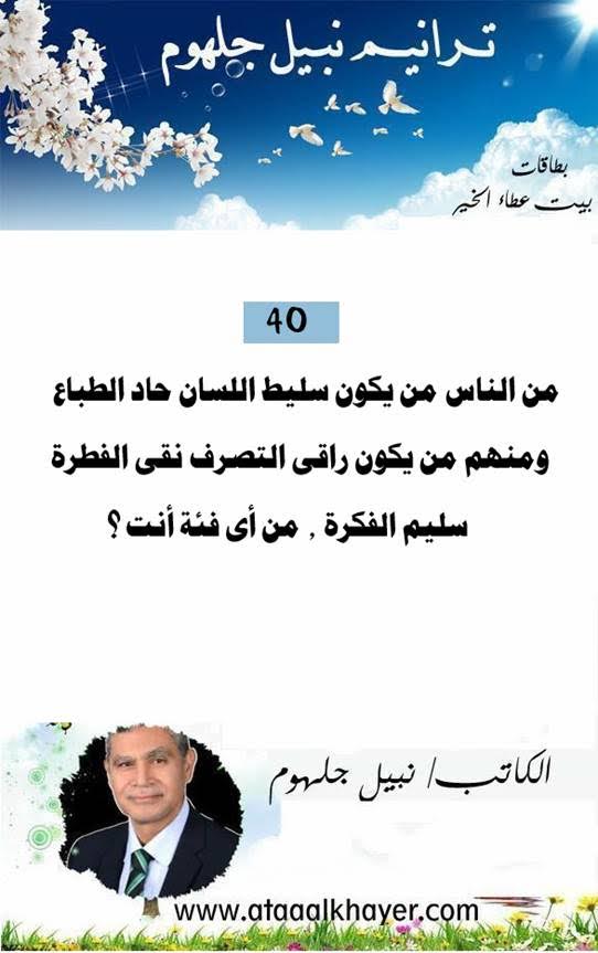 ترانيم نبيل جلهوم (40) من:الأخ الأستاذ / نبيل جلهوم عضو جمعية الكُتَّاب ببيت عطاء الخير عضو إتحاد الكتّاب و المثقفين العرب - مصر عضو رابطة أدباء الشام – لندن عضو الإتحاد العالمى للشعراء والمبدعين العرب عضو إتحاد المدربين العرب عضو رابطة الأدب الإسلامى العالمية http://www.ataaalkhayer.com/up/download.php?img=14923 |