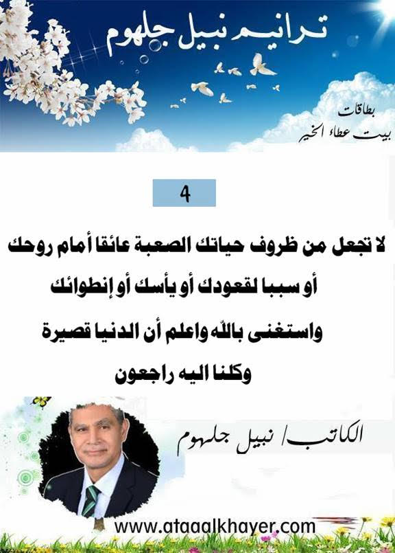 ترانيم نبيل جلهوم (04) من:الأخ الأستاذ / نبيل جلهوم عضو جمعية الكُتَّاب ببيت عطاء الخير عضو إتحاد الكتّاب و المثقفين العرب - مصر عضو رابطة أدباء الشام – لندن عضو الإتحاد العالمى للشعراء والمبدعين العرب عضو إتحاد المدربين العرب عضو رابطة الأدب الإسلامى العالمية http://www.ataaalkhayer.com/up/download.php?img=14622 |
