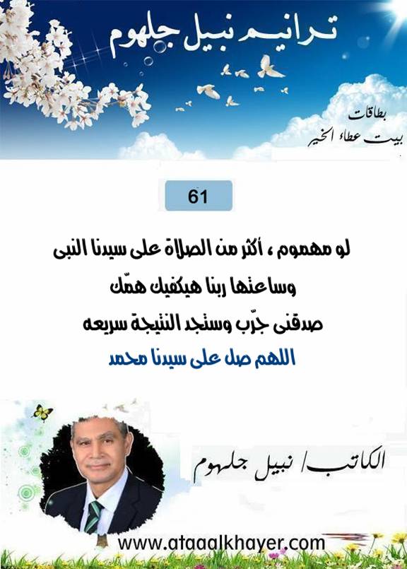 ترانيم نبيل جلهوم (61) من:الأخ الأستاذ / نبيل جلهوم عضو جمعية الكُتَّاب ببيت عطاء الخير عضو إتحاد الكتّاب و المثقفين العرب - مصر عضو رابطة أدباء الشام – لندن عضو الإتحاد العالمى للشعراء والمبدعين العرب عضو إتحاد المدربين العرب عضو رابطة الأدب الإسلامى العالمية http://www.ataaalkhayer.com/up/download.php?img=15099 |