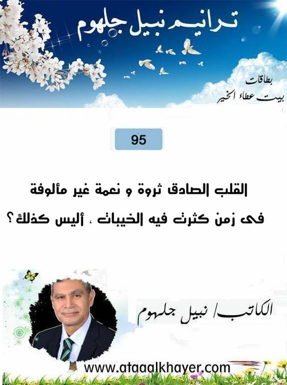 ترانيم نبيل جلهوم (95) من:الأخ الأستاذ / نبيل جلهوم عضو جمعية الكُتَّاب ببيت عطاء الخير عضو إتحاد الكتّاب و المثقفين العرب - مصر عضو رابطة أدباء الشام – لندن عضو الإتحاد العالمى للشعراء والمبدعين العرب عضو إتحاد المدربين العرب عضو رابطة الأدب الإسلامى العالمية http://www.ataaalkhayer.com/up/download.php?img=15269 |