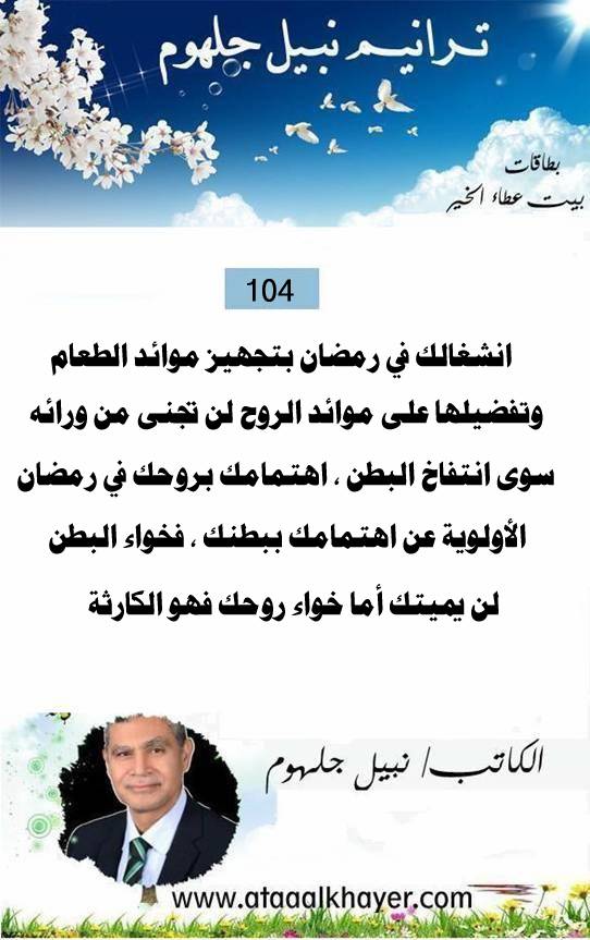ترانيم نبيل جلهوم (104) من:الأخ الأستاذ / نبيل جلهوم عضو جمعية الكُتَّاب ببيت عطاء الخير عضو إتحاد الكتّاب و المثقفين العرب - مصر عضو رابطة أدباء الشام – لندن عضو الإتحاد العالمى للشعراء والمبدعين العرب عضو إتحاد المدربين العرب عضو رابطة الأدب الإسلامى العالمية http://www.ataaalkhayer.com/up/download.php?img=15325 |