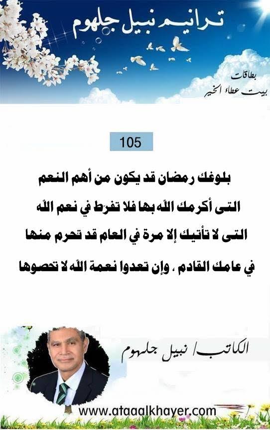 ترانيم نبيل جلهوم (105) من:الأخ الأستاذ / نبيل جلهوم عضو جمعية الكُتَّاب ببيت عطاء الخير عضو إتحاد الكتّاب و المثقفين العرب - مصر عضو رابطة أدباء الشام – لندن عضو الإتحاد العالمى للشعراء والمبدعين العرب عضو إتحاد المدربين العرب عضو رابطة الأدب الإسلامى العالمية http://www.ataaalkhayer.com/up/download.php?img=15328 |