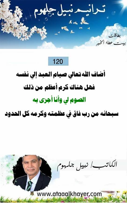 ترانيم نبيل جلهوم (120) من:الأخ الأستاذ / نبيل جلهوم عضو جمعية الكُتَّاب ببيت عطاء الخير عضو إتحاد الكتّاب و المثقفين العرب - مصر عضو رابطة أدباء الشام – لندن عضو الإتحاد العالمى للشعراء والمبدعين العرب عضو إتحاد المدربين العرب عضو رابطة الأدب الإسلامى العالمية http://www.ataaalkhayer.com/up/download.php?img=15440 |