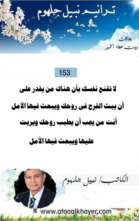 ترانيم نبيل جلهوم (153) من:الأخ الأستاذ / نبيل جلهوم عضو جمعية الكُتَّاب ببيت عطاء الخير عضو إتحاد الكتّاب و المثقفين العرب - مصر عضو رابطة أدباء الشام – لندن عضو الإتحاد العالمى للشعراء والمبدعين العرب عضو إتحاد المدربين العرب عضو رابطة الأدب الإسلامى العالمية http://www.ataaalkhayer.com/up/download.php?img=15660 |